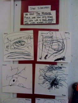 - We read”The Missing Piece” and saw only black and white. Lots of black shapes: lines, wiggles, triangles and longs! Illustrations by Shel Silverstein.