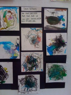 - We read “Cold Little Duck-Duck-Duck – we saw colors, charcoal outlines of ducks, and green grass.